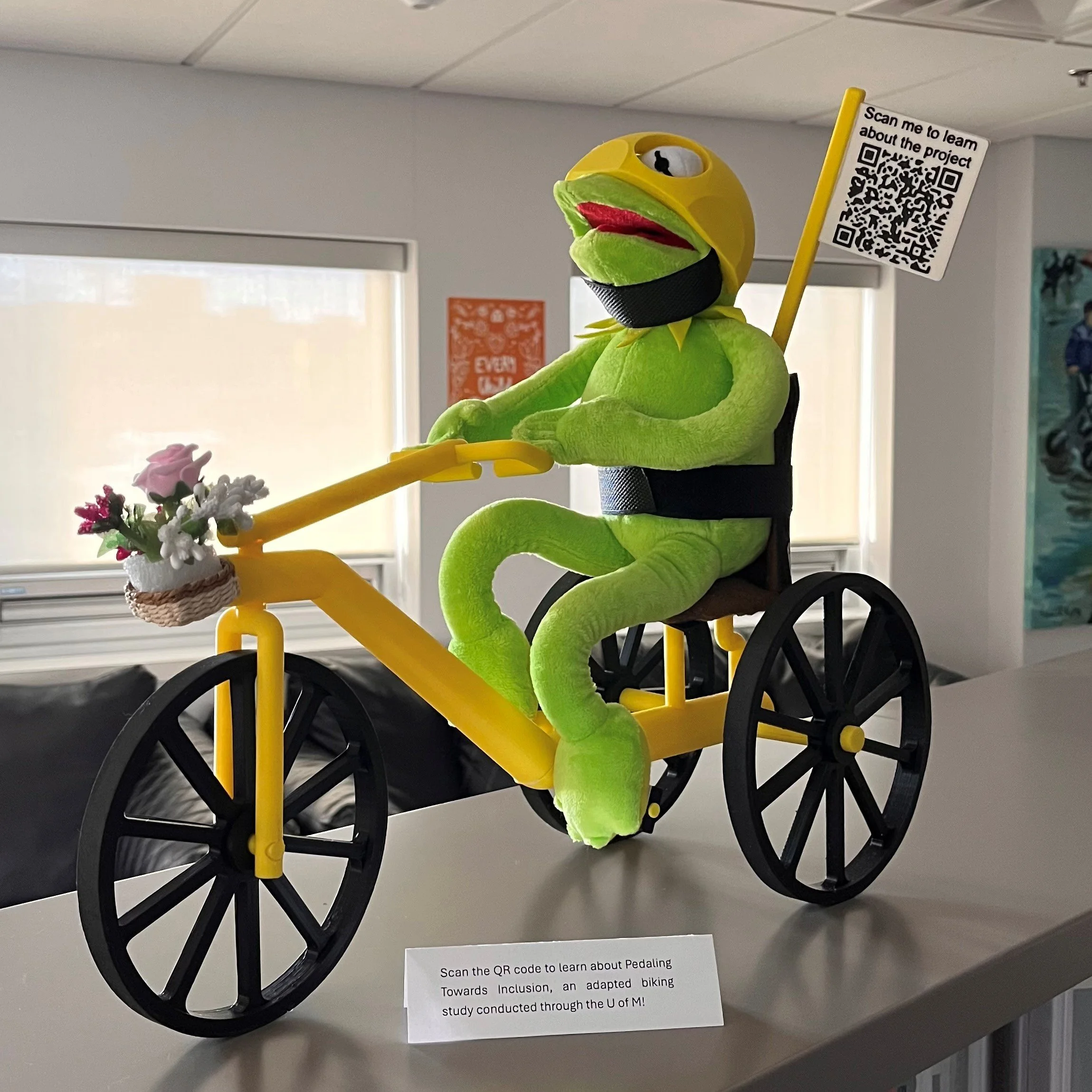 [photo] Caption text: A bicycle-riding frog invites people to read a study on the benefits of adapted biking.